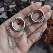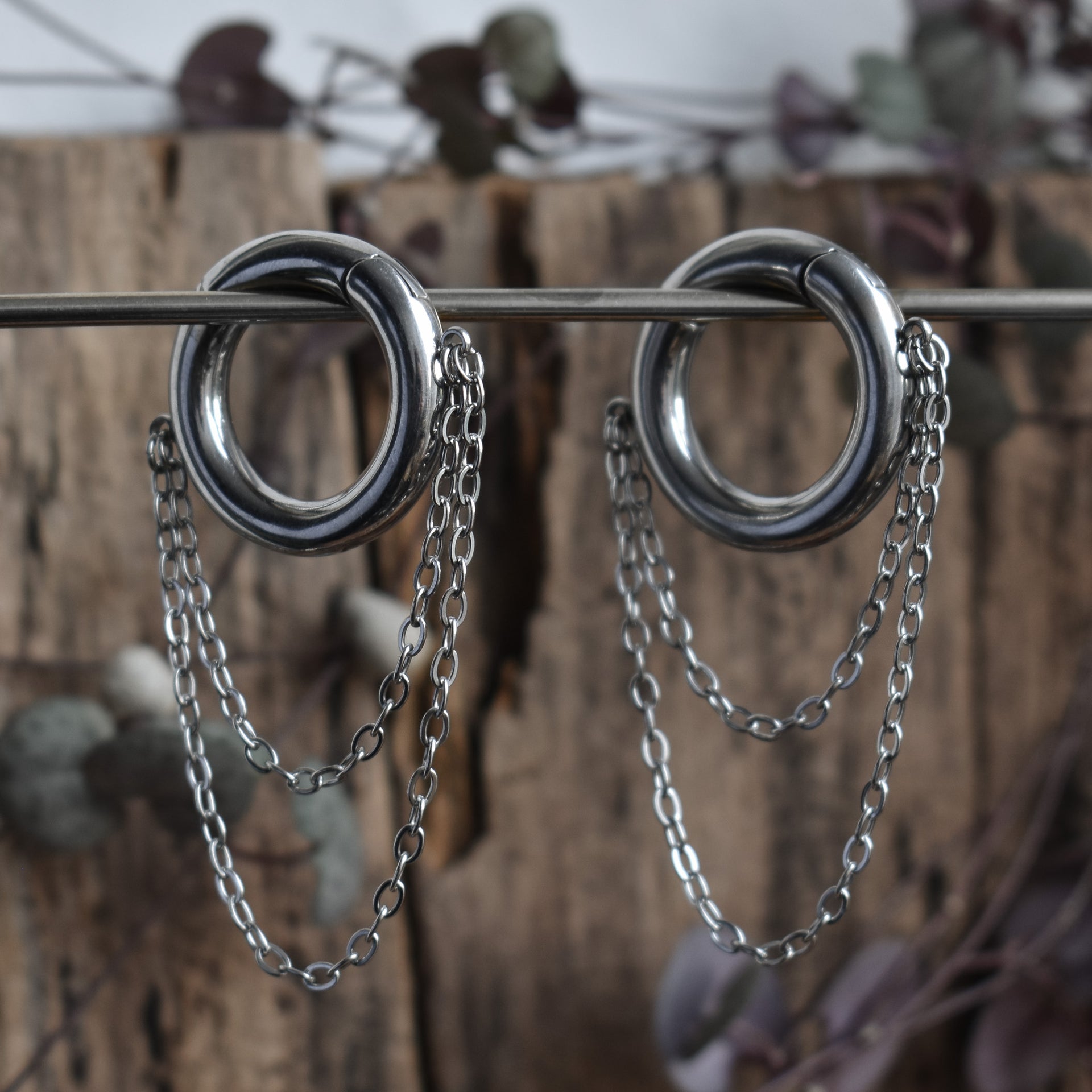 Silver Chain Ring Ear Weights for stretched lobes with magnetic closure. This elegant design features two chains on a chunky ring. They fit stretched ears starting at least 6 mm | 2 g and above. Also available in gold.