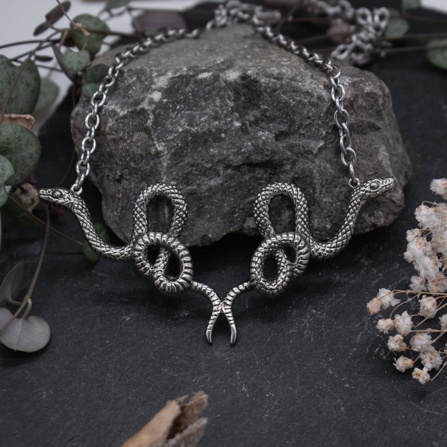 This Silver Double Snake Necklace features two elegant snakes, creating a flattering and eye-catching shape. Made with high-quality stainless steel chains and brass, this necklace adds a touch of sophistication and charm to any outfit. Also available in gold.