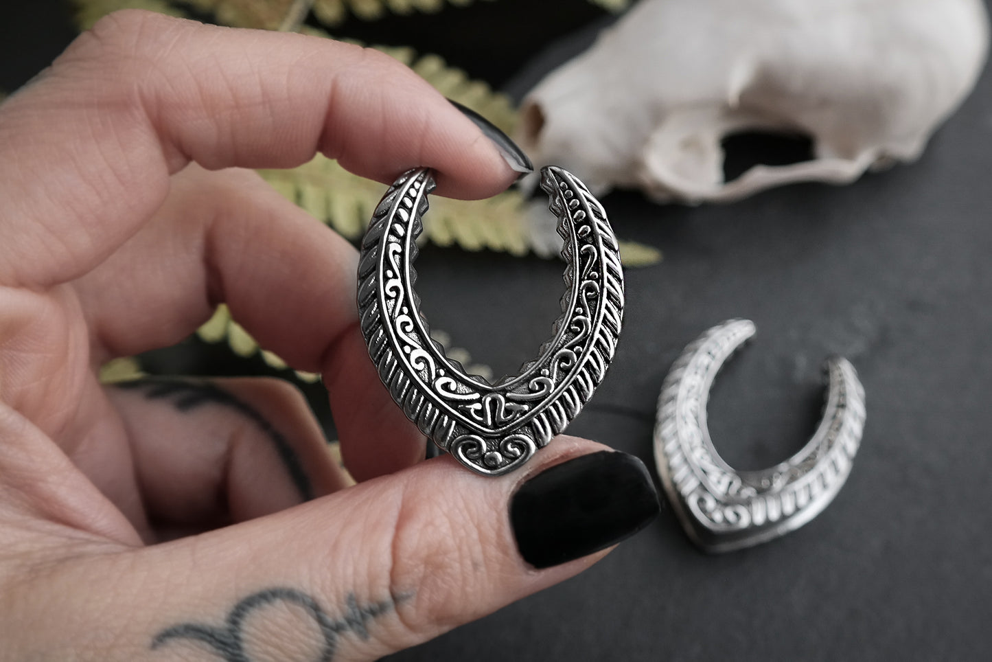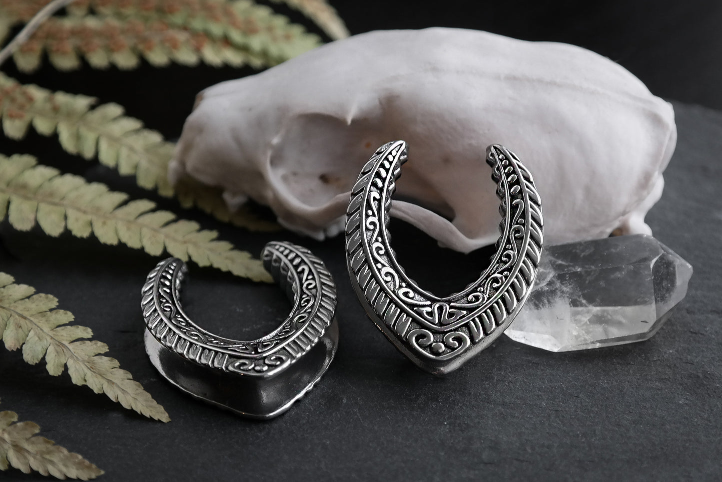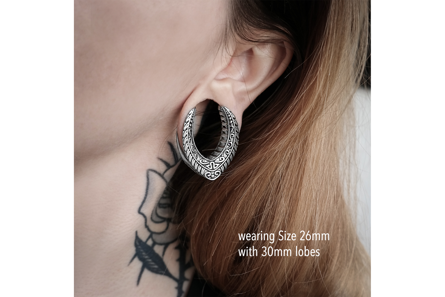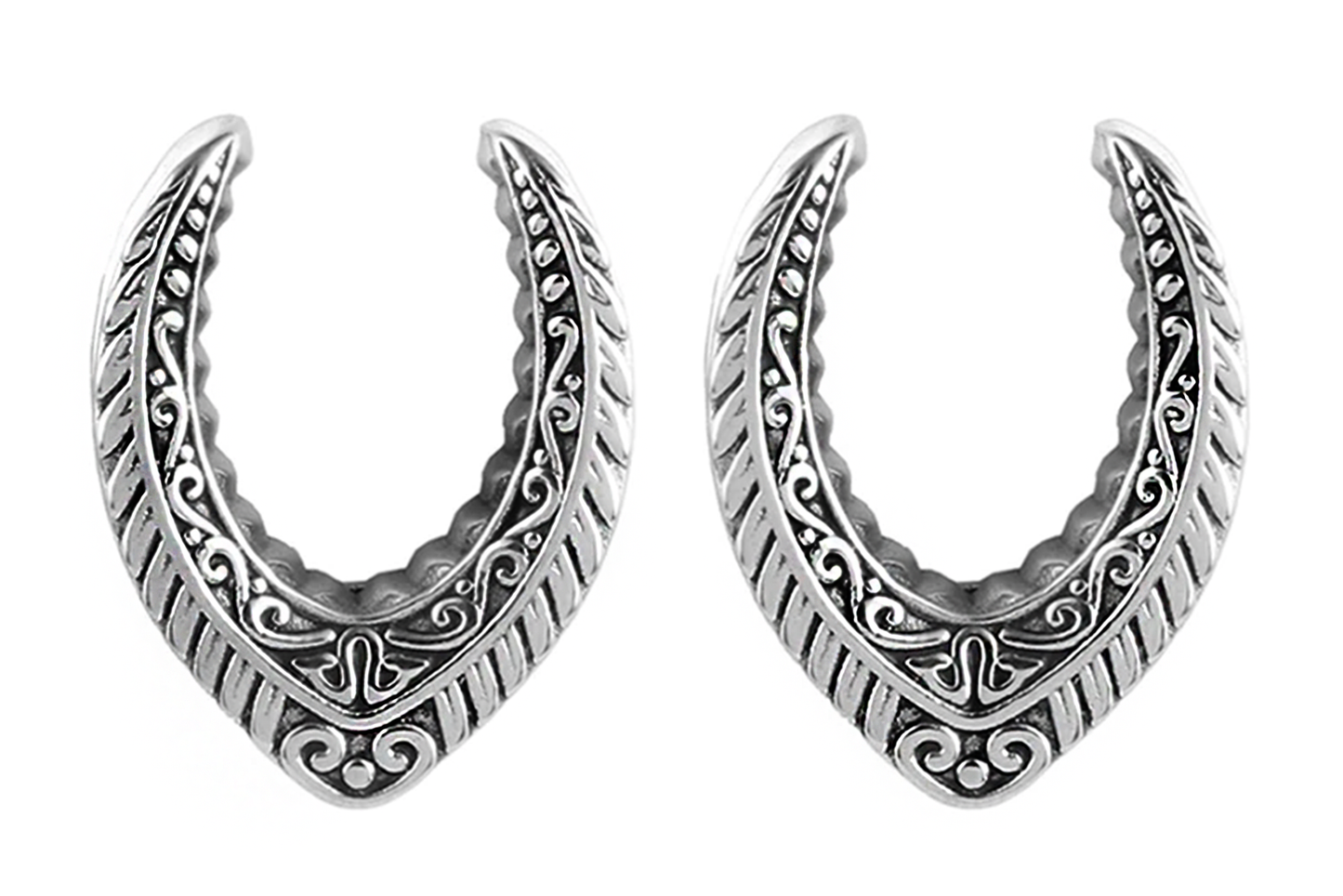 Silver Ornate V-Shaped Saddle Weights for stretched lobes. Wearable with size 8 mm | 0g and above. Also available in gold.