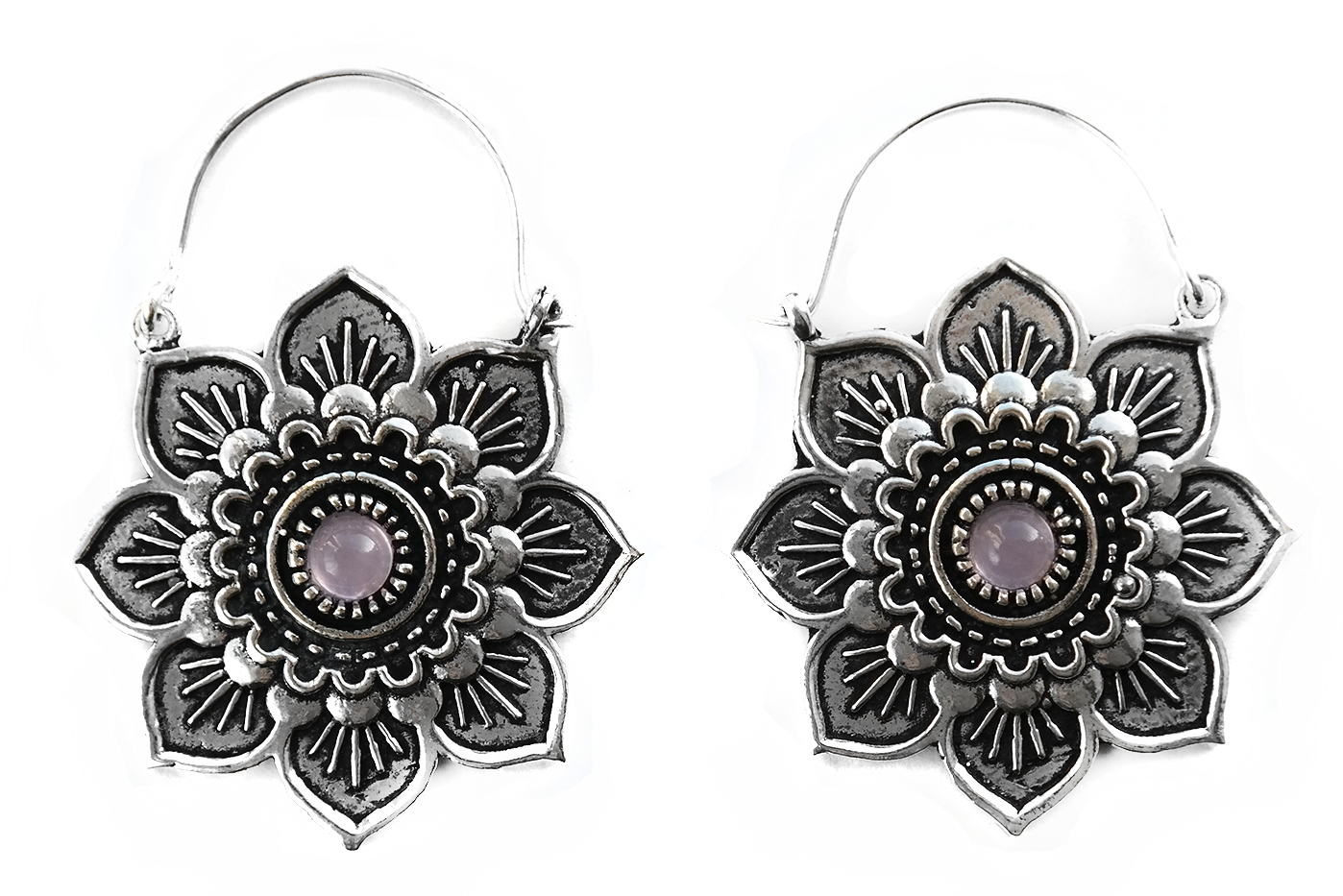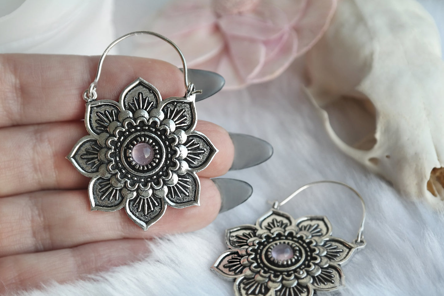 Silver Lotus Flower Hoop Earrings with rose quartz gemstones.
