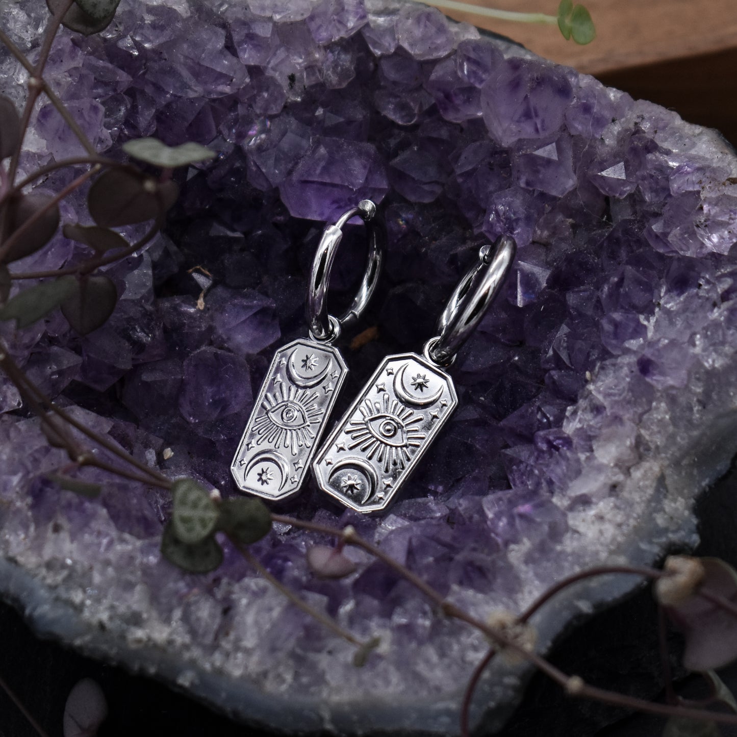 Complete your witchy look with these Silver Tarot Huggie Earrings. Crafted with stainless steel elements, the tarot pendants picture an eye and moon symbols. The huggie earrings fit standard pierced ears and are also wearable through flesh tunnels or saddle spreaders. Also available in gold.