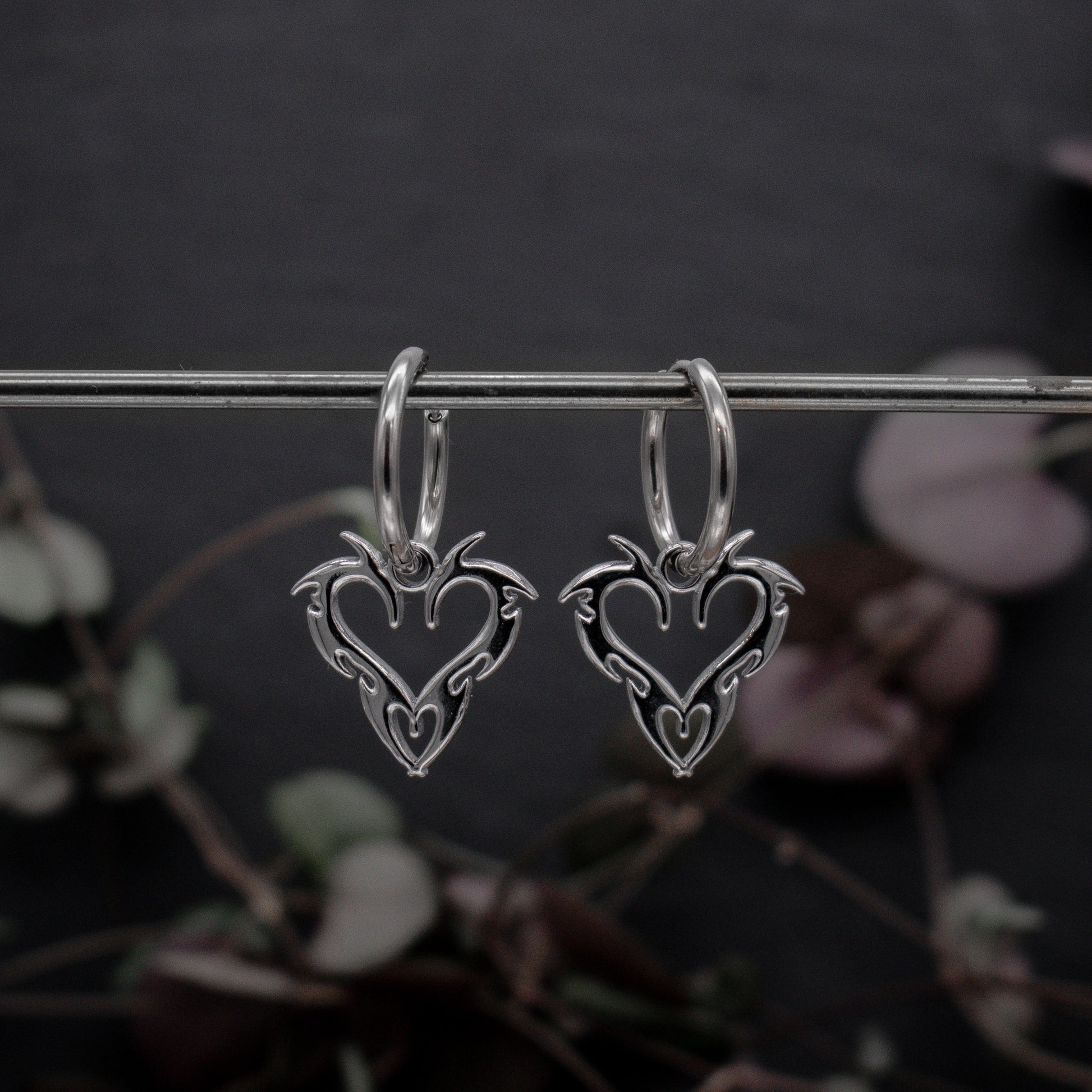 Silver Tribal Heart Hoops in stainless steel silver. Edgy 90s design meets everyday wearability. Lightweight, durable, and alternative.