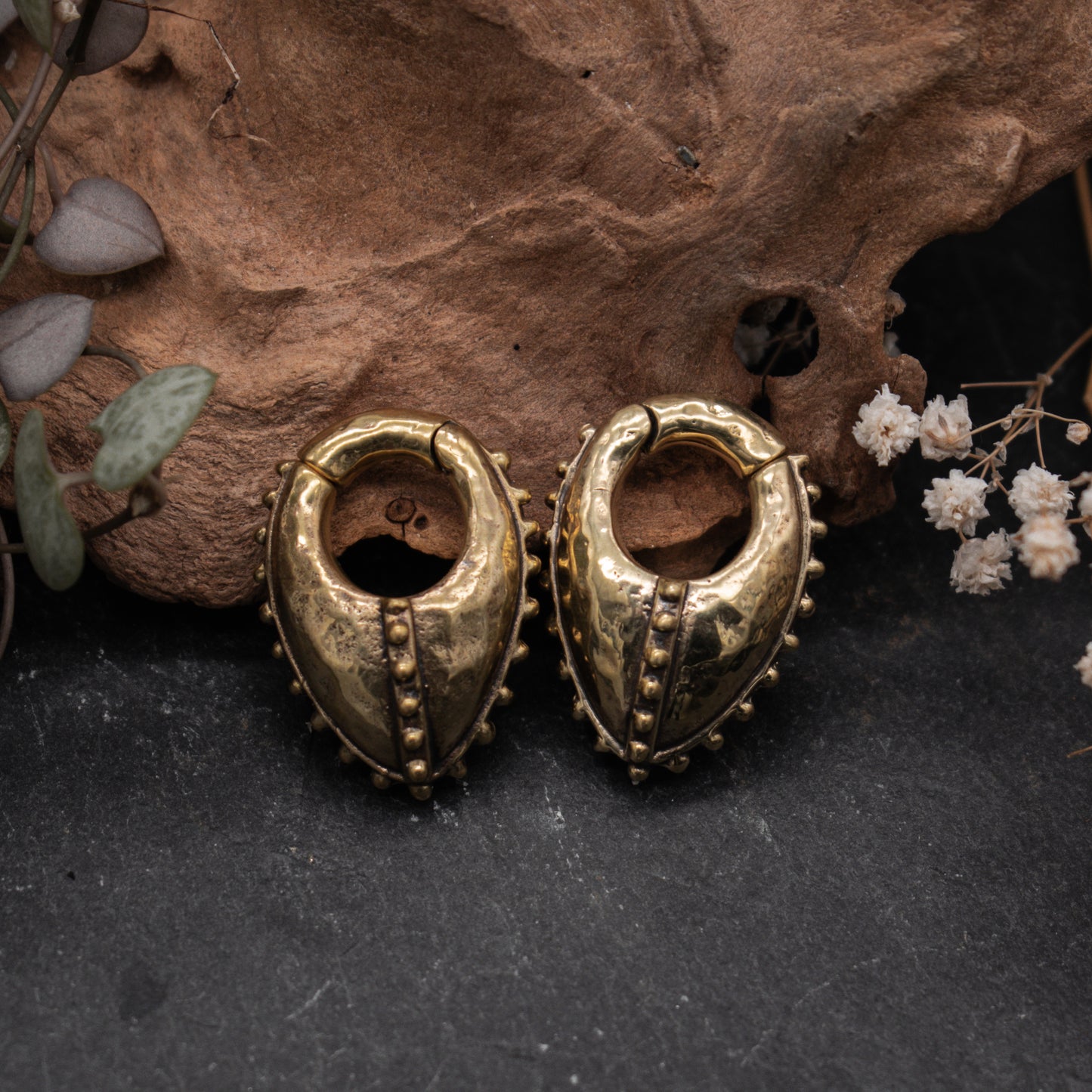 Tribal-style clicker hangers in a gold-colored finish, featuring a subtle hammered texture and delicate bead details. Crafted from high-quality brass and designed with a secure clicker closure, they’re perfect for stretched ear lobes. Suitable for sizes from 5 mm (4g) and up. Also available in silver.