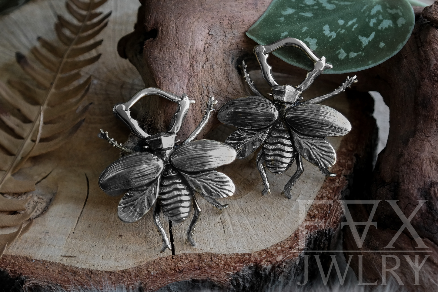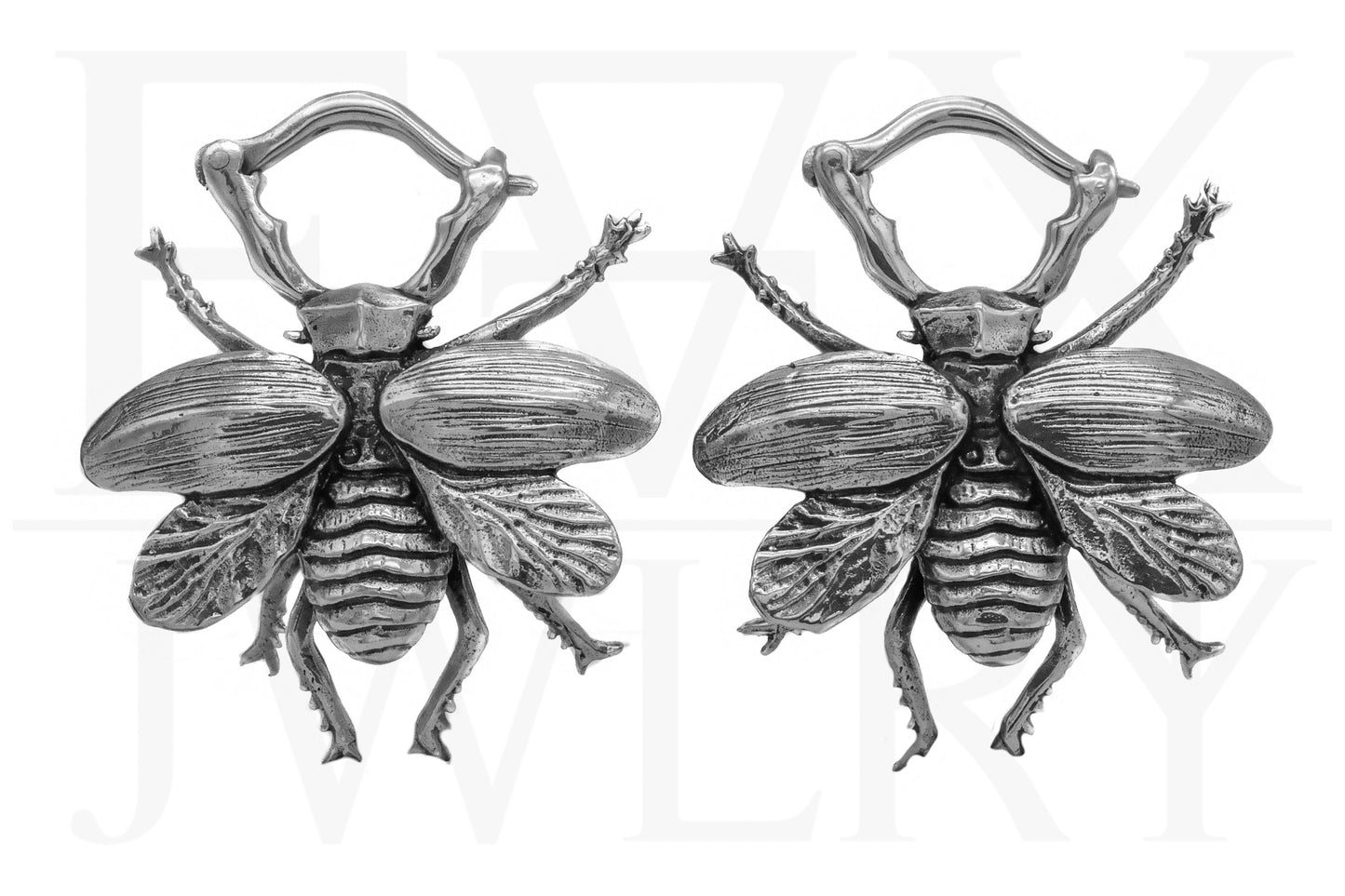 White Brass Beetle Ear Hangers for stretched lobes. Detailed beetle design. These hangers can fit stretched ears starting at least 3 mm | 8 g and above. Also available in gold brass.