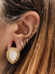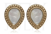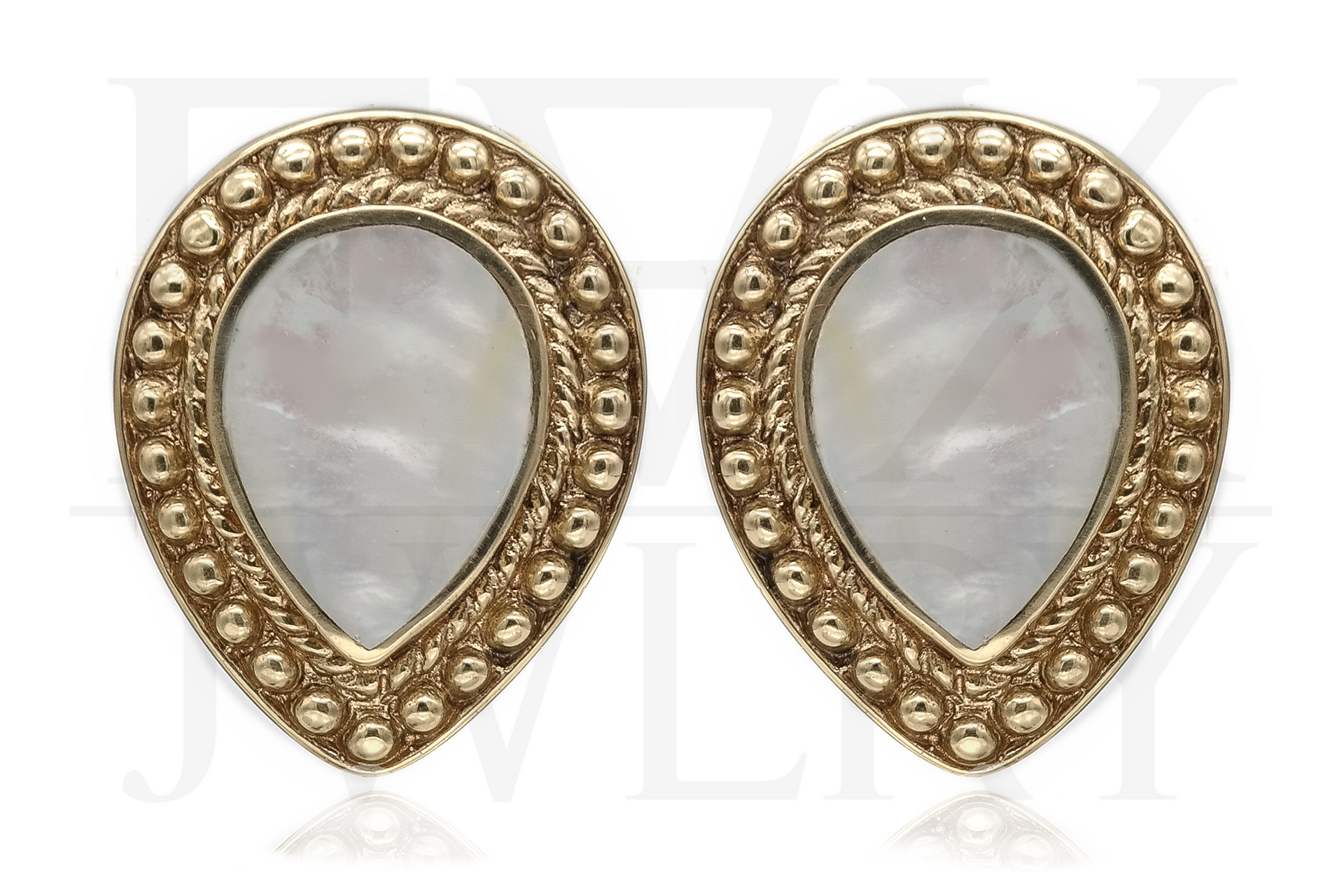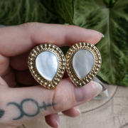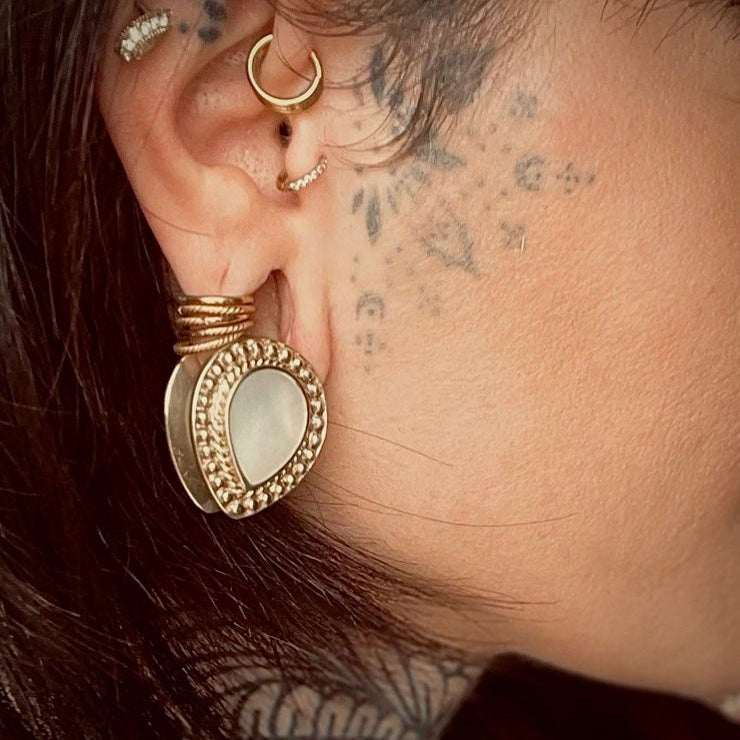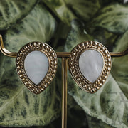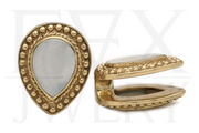 White Shell Teardrop Ear Weights. Stunning double sided design with white mother of pearl inlays. These hangers are able to fit stretched ears starting at least 14 mm | 9/16" and above. Also available in gold with black shell.